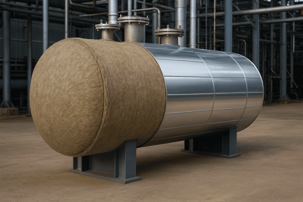 - Enchaquetado del tanque de 30 m³ con lana de roca, asegurando una envoltura completa que evitara pérdidas energéticas.