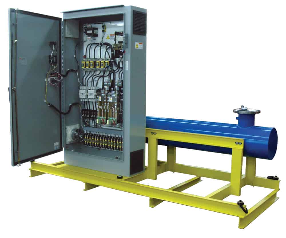 El diseño modular separa la potencia del control: el calentador cuenta con su propia caja de terminales NEMA 4 (estanca al agua), mientras que la electrónica sensible reside en un gabinete NEMA 12 ventilado.