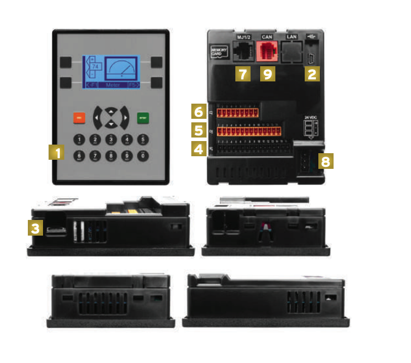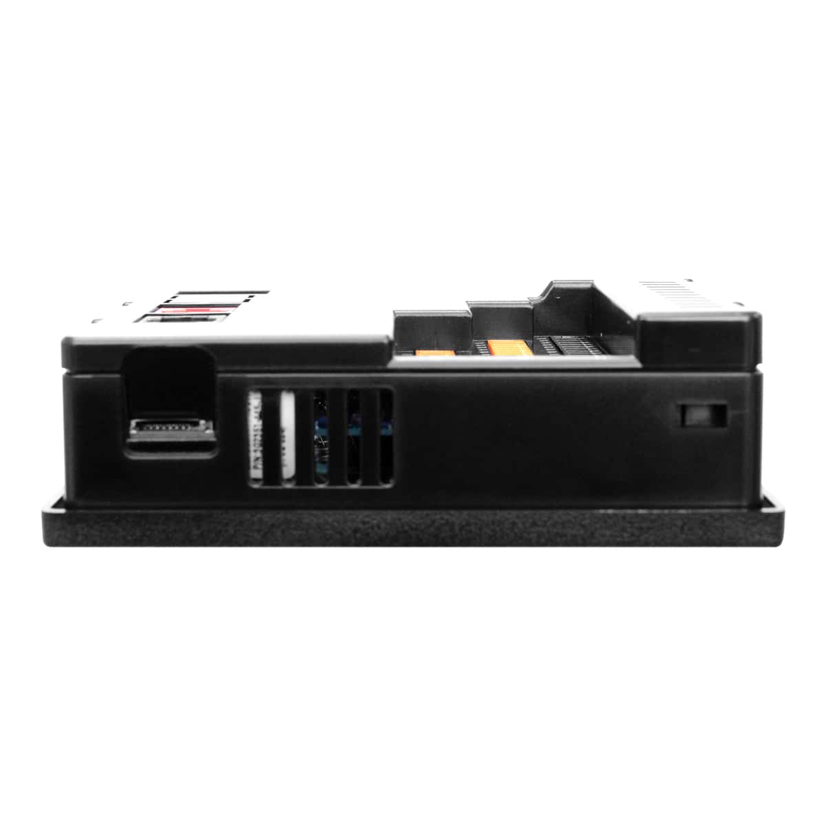 CONECTIVIDAD VERSÁTIL: Equipado con un puerto serial combinado (RS-232/485) para comunicación Modbus RTU, un puerto CAN (CsCAN) para expansión de E/S y un puerto USB mini-B para programación rápida. Soporta tarjetas microSD de hasta 32GB para registro de datos.
